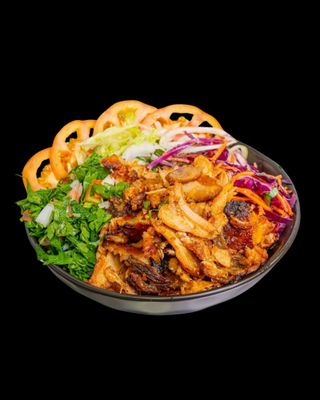 Our signature bowl served with chips, topped with cheese and fresh shaved chicken kebab along with two sauces.